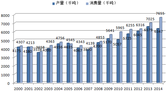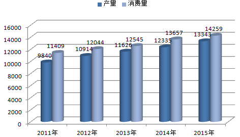 2011-2015年中國豆油生產與消費情況(單位:千噸)