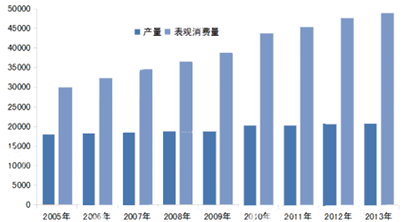 2005-2013年中國原油產量及表觀消費量統計數據(單位:萬噸)