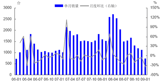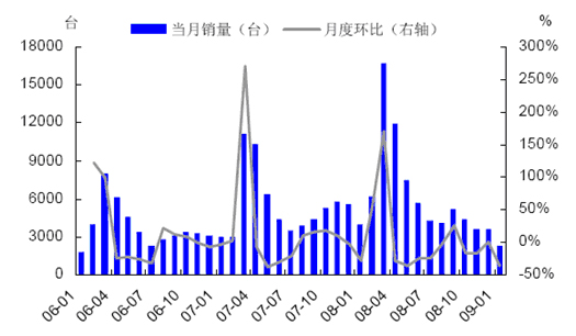 自2005 年以來,挖掘機行業增長迅速,2007 和2008 年的傳統旺季三月份和四月份,月度銷量均超過一萬臺。其中,2008 年三月份單月銷量高達16750 臺,創行業銷量紀錄。自7 月份始,行業月度銷量開始持續下滑。四季度的三個月份,銷量同比下降17%,37%,35%。就整個四季度而言,同比下降30.2%,環比下降15.2%。2009 年1 月份國內挖掘機銷量為2287 臺,同比下降42%,環比下降了38%,其中出口132 臺,同比下降66%。
