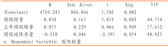 這個模型的樣本數量為9,F=131, F.sig=0.000。固定資產投資延續存量和挖掘機上1、2、3 的銷量的系數估計值的t-stat 并不顯著。