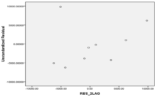 模型3 的樣本數量為N=10, adjusted R2=0.976, F 3,6=124.608,基本上都能令人滿意,但是D-W=3.019,表明此模型存在較嚴重的負自相關