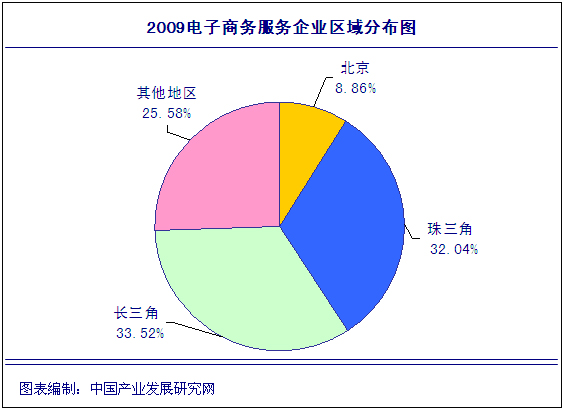 目前國內電子商務服務企業主要分布在長三角、珠三角一帶以及北京等經濟較為發達的省市。其中長三角占有33.52%的份額,珠三角占有32.04%,北京占有8.86%,國內其它地方共占有25.58%。可見,目前我國的電子商務服務企業多分布在經濟較為發達的省市,且電子商務配套產業環境良好,主要與其這些地方環境承載能力較強、政府扶持力度較大、經濟和人口聚集條件較好有關。