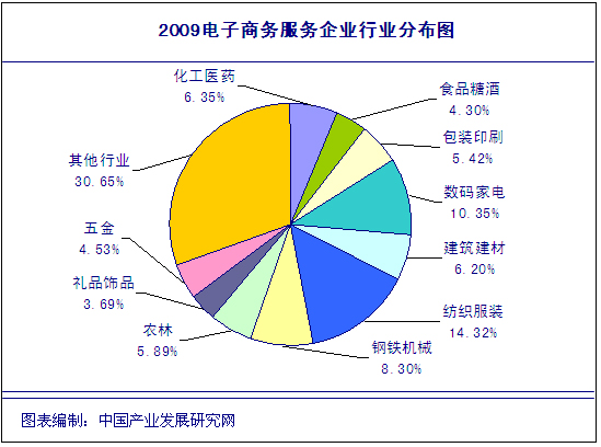 在電子商務服務企業的行業分布中,排在前十名的依次為:紡織服裝、數碼家電、鋼鐵機械、化工醫藥、建筑建材、農林、五金、包裝印刷、食品糖酒、禮品飾品這些行業領域。