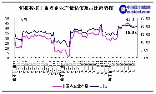 據測算,7月下旬非重點企業日粗鋼產量估值在41.2萬噸,環比上旬維持不變,占比19.8%,較上旬上升了0.5個百分點。由于市場價格的持續走高,管理流程快捷的小型鋼廠利潤較好,生產積極性增強,產量持續高位運行。