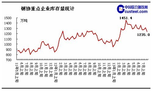 數據同時顯示,7月下旬重點統計鋼鐵企業庫存量本旬末為1235.04萬噸,較上旬末減量74.9萬噸。重點統計鋼鐵企業3月中旬庫存量達到頂峰后,至今震蕩下行,隨著市場成交活躍,后期仍將呈現“去庫存化”趨勢。