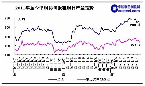 核心提示:七月下旬粗鋼產量再度跌破210萬噸據中國鋼鐵工業協會最新統計數據顯示,7月下旬重點企業粗鋼日產量167.3萬噸,減量4.6萬噸,旬環比下降2.16%;全國預估粗鋼日產量208.4萬噸,減量4.6萬噸,旬環比下降2.67%。自六月下旬重點企業日均產量創次新高后,進入七月份后重點企業的產量逐步走低,下旬再度跌破210萬噸。