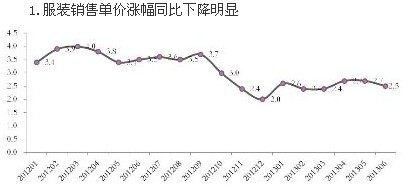 另據中華全國商業信息中心的統計,2013年上半年,全國重點大型零售企業服裝類商品銷售單價同比漲幅較2012年同期下降近10個百分點,下降幅度明顯。
