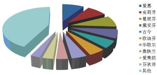 2013年6月份全國重點大型零售企業女性內衣銷售前十位品牌市場份額合計為57.1%,愛慕、安莉芳和曼妮芬占據前三位。