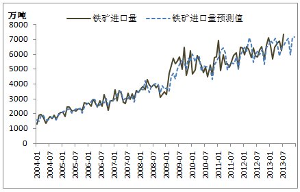 盡管以上我們對7月份鐵礦石進口量超預期作出了一定合理的解釋,但我們不能否認,這一進口數據仍有部分無法解釋的成分,其中既有偶然因素,也有一些不確定因素(如進口許可證發放有可能對進口預期產生影響),下半年很難再達到這一數量。根據建立的時間序列預測模型,我們得到后續5個月的鐵礦石進口量預測值分別為:6850、7086、5958、7088、7158萬噸,最高點出現在12月份,仍低于7月份的進口數量。