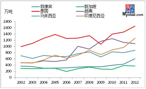 近年來,東盟各國表觀消費增長明顯。2012年,大多數(shù)東盟國家的鋼材表觀消費都取得了兩位數(shù)的增幅,其中,菲律賓同比增幅是東盟國家中最高的,達(dá)到了19.1%;印度尼西亞同比增長15.9%;泰國是東盟地區(qū)最大的鋼材消費國,同比增長13.9%達(dá)到1657萬噸;越南和馬來西亞的同比增長也達(dá)到了12.9%和6.9%;僅新加坡略有下滑,同比減少2.3%。據(jù)東南亞鋼鐵協(xié)會(SEAISI)預(yù)測,2013年東盟六國(越南、新加坡、泰國、印尼、菲律賓、馬來西亞)的鋼材表觀消費將繼續(xù)增長5.3%達(dá)到6200萬噸。一方面,東盟各國表觀消費增長明顯,另一方面,該地區(qū)鋼材產(chǎn)量的增長卻相對較為緩慢,難以滿足成員國的用鋼需求,因此東盟國家很大一部分的鋼材消費都是通過進(jìn)口來滿足的。以2012年為例,該地區(qū)鋼材進(jìn)口量同比增長20.8%達(dá)到4116萬噸,表觀消費同比增長12.3%達(dá)到5886萬噸,而同期鋼產(chǎn)量僅為2543萬噸,同比增幅也只有2.7%。我國是東盟各國主要的進(jìn)口來源地,因此,東盟各國鋼材表觀消費的明顯增長也帶動了我國對該地區(qū)出口的大幅增加。