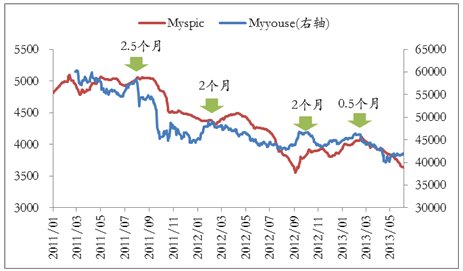 基于此,我們用Excel對兩者進(jìn)行相關(guān)性分析,相關(guān)性變化如圖表2所示。可以看出,同樣的時間點,兩者的相關(guān)系數(shù)為0.88,而將Myspic指數(shù)前移1個月左右的相關(guān)系數(shù)達(dá)到最大值0.92,即Myyouse指數(shù)領(lǐng)先于Myspic指數(shù)1個月左右。