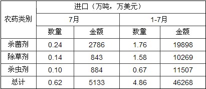 7月份中國進口農藥0.62萬噸 同比大漲57.1%
