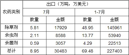 7月份,除草劑出口量保持第一,達5.81萬噸,同比增長24.1%,出口金額同樣保持大幅增長,增幅為47.8%,達到1.79億美元;殺蟲劑出口量為2.11萬噸,同比增長33.1%;殺菌劑出口0.59萬噸,同比小幅增長6.4%。
