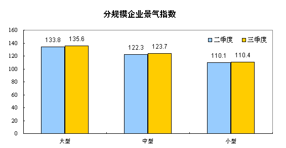 分企業規模看,大、中、小型企業景氣指數分別為135.6、123.7、110.4,分別比二季度回升1.8、1.4和0.3點。