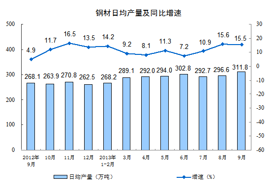 分產(chǎn)品看,9月份,464種產(chǎn)品中有304種產(chǎn)品同比增長。其中,發(fā)電量4310億千瓦時,同比增長8.2%;鋼材9355萬噸,增長15.5%;水泥22505萬噸,增長6.4%;十種有色金屬345萬噸,增長10.1%;乙烯127萬噸,增長13.7%;汽車207.3萬輛,增長17.5%;轎車113.8萬輛,增長10.4%;原油加工量3865萬噸,下降1.2%。