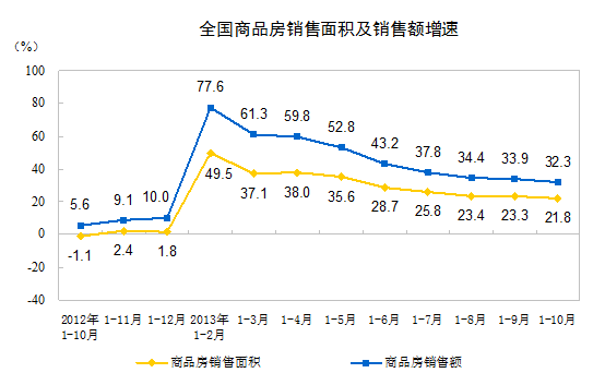 1-10月份,商品房銷售面積95931萬平方米,同比增長21.8%,增速比1-9月份回落1.5個百分點;其中,住宅銷售面積增長22.3%,辦公樓銷售面積增長30.6%,商業(yè)營業(yè)用房銷售面積增長11.2%。商品房銷售額61238億元,增長32.3%,增速比1-9月份回落1.6個百分點;其中,住宅銷售額增長32.6%,辦公樓銷售額增長42.5%,商業(yè)營業(yè)用房銷售額增長23.0%。