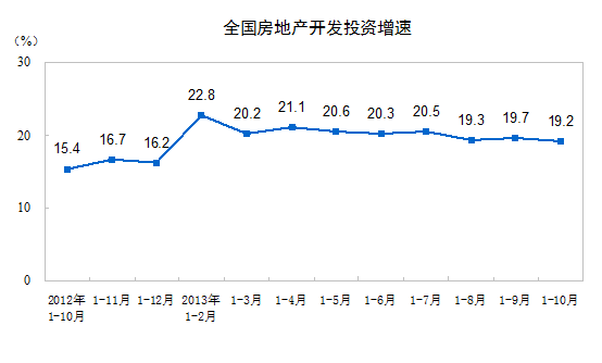 2013年1-10月份,全國房地產(chǎn)開發(fā)投資68693億元,同比增長19.2%,增速比1-9月份回落0.5個百分點。其中,住宅投資47222億元,增長18.9%,增速回落0.6個百分點,占房地產(chǎn)開發(fā)投資的比重為68.7%。