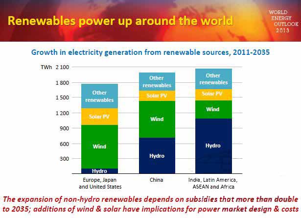 亞洲等的新興市場國家將成為可再生能源增長的核心。尤其是中國,可再生能源到2035年將達到接近2000TWh,比歐洲、美國和日本之和還要多。另外,印度、拉丁美洲、東盟(ASEAN)及非洲的可再生能源也將大幅增長,到2035年合計將達到2100TWh。