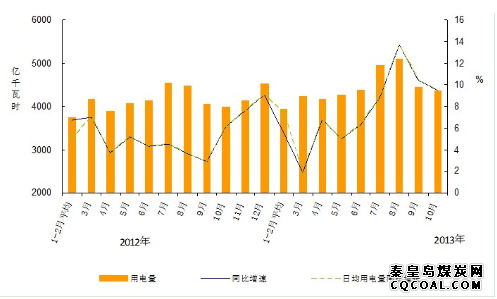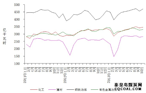 10月份,四大高載能行業(yè)用電量合計(jì)1431億千瓦時(shí),同比增長 8.6%,增速比9月提高0.5個(gè)百分點(diǎn),環(huán)比增長2.3%;合計(jì)用電量占全社會(huì)用電量的比重為32.7%。其中,化工行業(yè)用電量347億千瓦時(shí),同比增長5.8%,環(huán)比增長2.0%;建材行業(yè)用電量283億千瓦時(shí),同比增長10.3%,環(huán)比增長1.9%;黑色金屬冶煉行業(yè)用電量471億千瓦時(shí),同比增長15.7%,環(huán)比增長3.3%;有色金屬冶煉行業(yè)331億千瓦時(shí),同比增長1.1%,環(huán)比增長1.5%。
