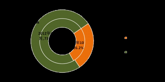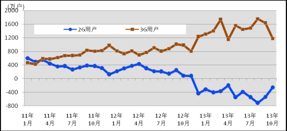 移動(dòng)電話用戶累計(jì)凈增突破1億戶,3G滲透率達(dá)到31.2%。1-10月,全國移動(dòng)電話用戶凈增1.04億戶,總數(shù)達(dá)到12.16億戶。其中,3G移動(dòng)電話用戶凈增1.47萬戶,對(duì)移動(dòng)電話用戶的增長(zhǎng)貢獻(xiàn)達(dá)到141.5%,比去年同期凈增多6261.1萬戶。3G用戶總數(shù)達(dá)到3.79億戶,在移動(dòng)電話用戶中滲透率達(dá)到31.2%,分別比去年同期、上月提高11.8、0.7個(gè)百分點(diǎn)。在TD終端款數(shù)和出貨量大幅提高的雙重刺激下,TD用戶占比明顯提高。1-10月TD用戶累計(jì)凈增突破8700萬戶,總數(shù)達(dá)1. 76億戶,占3G移動(dòng)電話用戶比重達(dá)到46.3%。圖3. 2011年-2013年2G用戶和3G用戶凈增比較