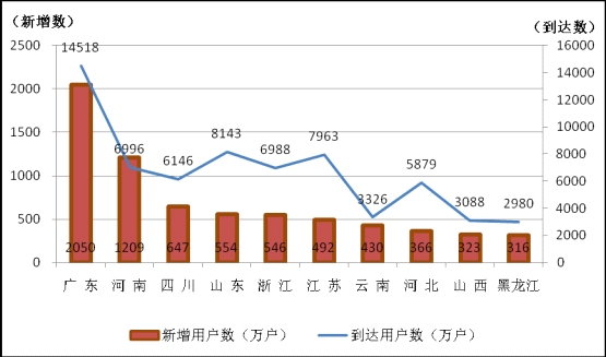 1-10月,東、中、西部地區(qū)移動(dòng)電話用戶分別凈增4980.0、2603.2、2797.8萬戶,占比分別為48.1%、25.1%和26.8%。全國移動(dòng)電話用戶增長(zhǎng)最快的前三個(gè)省份分別是廣東、河南和四川,但三者之間的差距明顯。廣東省在移動(dòng)用戶總數(shù)和凈增數(shù)均保持絕對(duì)優(yōu)勢(shì),分別達(dá)到14517.6萬戶和2049.6萬戶,比河南和四川的總和還多1375.7、193.5萬,占全國總數(shù)的比重分別為11.9%、19.8%。圖12. 2013年10月移動(dòng)電話用戶新增用戶數(shù)前十的省份