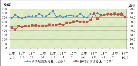 點(diǎn)對(duì)點(diǎn)短信業(yè)務(wù)量月均下滑0.8個(gè)百分點(diǎn),彩信業(yè)務(wù)量增長(zhǎng)有所趨緩。在企業(yè)短信平臺(tái)短信量的拉動(dòng)下,1-10月,全國移動(dòng)短信業(yè)務(wù)量7693.4億條,同比增長(zhǎng)2.8%,比上月回落0.2個(gè)百分點(diǎn)。其中,點(diǎn)對(duì)點(diǎn)短信量3702.7億條,同比下降12.6%,占移動(dòng)短信業(yè)務(wù)量的比重下降至48.1%,今年以來月均下滑0.8個(gè)百分點(diǎn)。業(yè)務(wù)向移動(dòng)互聯(lián)網(wǎng)轉(zhuǎn)型加快,增值企業(yè)短信量快速下滑,同比下降17.1%。彩信業(yè)務(wù)量增速趨緩,1-10月,移動(dòng)彩信業(yè)務(wù)量755.1億條,同比增長(zhǎng)31.8%,比上月回落1.6個(gè)百分點(diǎn)。其中,點(diǎn)對(duì)點(diǎn)彩信量45.6億條,同比增長(zhǎng)11.4%,比上月回落1.9個(gè)百分點(diǎn)。圖8. 2011-2013年移動(dòng)短信業(yè)務(wù)量和彩信業(yè)務(wù)量各月比較