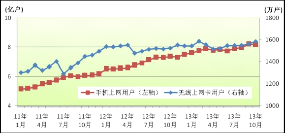 無線上網(wǎng)卡用戶規(guī)模小幅增長(zhǎng),3G上網(wǎng)用戶比例超過三分之一。1-10月,移動(dòng)互聯(lián)網(wǎng)用戶凈增5220.7萬戶,總數(shù)達(dá)到8.17億戶,對(duì)移動(dòng)電話用戶的滲透率達(dá)到67.2%。無線上網(wǎng)卡用戶累計(jì)新增40.8萬戶,達(dá)到1584.1萬戶,占移動(dòng)互聯(lián)網(wǎng)用戶的比重持續(xù)保持1.9%。隨著3G移動(dòng)電話用戶普及率的不斷提升,3G上網(wǎng)用戶的規(guī)模持續(xù)擴(kuò)大,達(dá)2.81億戶,占移動(dòng)互聯(lián)網(wǎng)用戶的比重達(dá)34.5%。其中,TD上網(wǎng)用戶占3G上網(wǎng)用戶的比重達(dá)到44.5%。圖5. 2011-2013年手機(jī)上網(wǎng)用戶和無線上網(wǎng)卡用戶比較