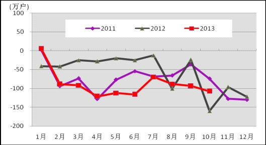 固定電話用戶占比降至18.1%,農(nóng)村固定電話退網(wǎng)速度加快。1-10月,全國固定電話用戶減少882.4萬戶,達(dá)到2.69億戶,占電話用戶總數(shù)比重降至18.1%,比去年末下降1.9個(gè)百分點(diǎn)。農(nóng)村固定電話用戶退網(wǎng)速度明顯快于城市固定電話用戶,前10個(gè)月農(nóng)村固定電話用戶減少547萬戶,比城市電話用戶多211.6萬戶,總數(shù)下降到8374.9萬戶,在固定電話用戶的比重由去年末的32.1%下降至31.1%。圖2. 2011-2013年固定電話用戶各月凈增比較
