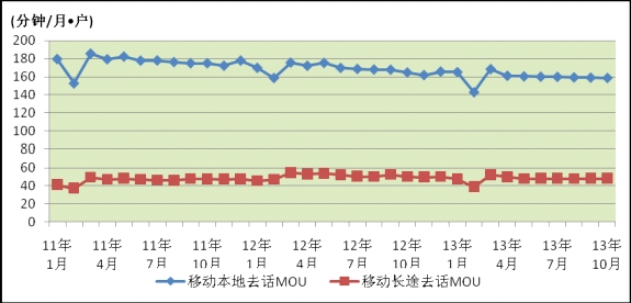 移動(dòng)本地和移動(dòng)話音增速小幅回升,移動(dòng)去話MOU值同比降幅收窄。“一戶多卡”用戶的持續(xù)增長(zhǎng)繼續(xù)拉低MOU值,互聯(lián)網(wǎng)應(yīng)用對(duì)話音的替代效應(yīng)日益顯著,移動(dòng)話音業(yè)務(wù)增速進(jìn)一步放緩。1-10月,全國移動(dòng)電話去話通話時(shí)長(zhǎng)24085.7億分鐘,同比增長(zhǎng)5.2%,比上月持平,比去年同期增速下降8.0個(gè)百分點(diǎn)。其中,移動(dòng)本地去話通話時(shí)長(zhǎng)和移動(dòng)長(zhǎng)途通話時(shí)長(zhǎng)分別為18499.3、5586.9億分鐘,同比增長(zhǎng)5.1%和5.8%,分別比上月提高0.1、0.3個(gè)百分點(diǎn)。由于移動(dòng)語音業(yè)務(wù)量增速大幅低于用戶的增長(zhǎng),每用戶每月貢獻(xiàn)的移動(dòng)語音業(yè)務(wù)量同比持續(xù)下降,但降幅有所收窄。移動(dòng)本地去話MOU為158.8分鐘/月·戶,移動(dòng)長(zhǎng)途去話MOU為48.0分鐘/月·戶,分別同比下降6.1%、5.5%,比上月收窄0.1、0.3個(gè)百分點(diǎn)。圖7. 2011-2013年移動(dòng)本地和長(zhǎng)途去話MOU值各月比較
