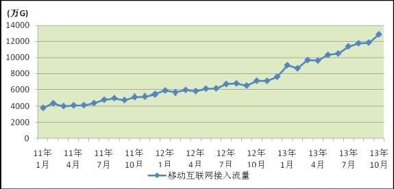 移動(dòng)互聯(lián)網(wǎng)接入流量單月突破1.2萬G,手機(jī)上網(wǎng)流量比例接近70%。1-10月,全國固定互聯(lián)網(wǎng)寬帶接入時(shí)長(zhǎng)261200.0億分鐘,同比增長(zhǎng)14.0%。移動(dòng)互聯(lián)網(wǎng)接入流量105545.5萬G,同比增長(zhǎng)68.9%,連續(xù)六個(gè)月增長(zhǎng)率超過60%。當(dāng)月移動(dòng)互聯(lián)網(wǎng)接入流量突破1.2萬G,達(dá)到12869.2G,戶均移動(dòng)互聯(lián)網(wǎng)接入流量達(dá)到133.6M,同比增長(zhǎng)45.7%。其中手機(jī)上網(wǎng)流量占比達(dá)69.8%,月戶均手機(jī)上網(wǎng)接入流量達(dá)到96.8M。圖9. 2011-2013年移動(dòng)互聯(lián)網(wǎng)接入流量各月比較