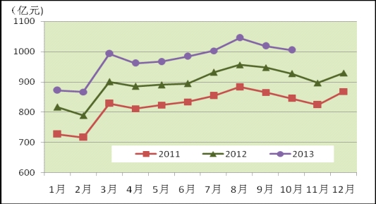 電信業(yè)務(wù)總量和業(yè)務(wù)收入繼續(xù)保持穩(wěn)定增長(zhǎng)。10月份,全國電信業(yè)務(wù)總量完成1183.5億元[ 按照2010年不變單價(jià)計(jì)算。],同比增長(zhǎng)7.7%;電信主營業(yè)務(wù)收入完成1004.6億元,同比增長(zhǎng)8.2%。1-10月,全國電信業(yè)務(wù)總量累計(jì)完成11592.7億元,連續(xù)兩個(gè)月保持7.8%的同比增長(zhǎng);電信主營業(yè)務(wù)收入累計(jì)完成9713.3億元,同比增長(zhǎng)8.6%,與上月持平。圖1. 2011-2013年各月電信主營業(yè)務(wù)收入比較