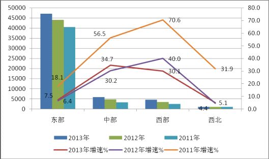 圖3 2011年-2013年10月東、中、西、東北產值情況