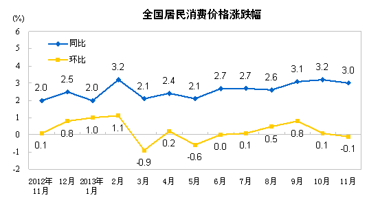 核心提示:11月全國居民消費價格總水平同比上漲3.0%