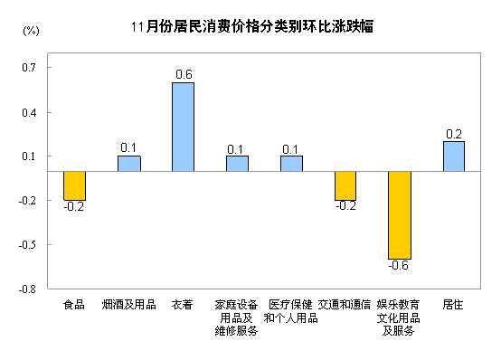 11月份,全國居民消費價格總水平環比下降0.1%。其中,城市下降0.1%,農村持平(漲跌幅度為0,下同);食品價格下降0.2%,非食品價格持平;消費品價格持平,服務價格下降0.2%。