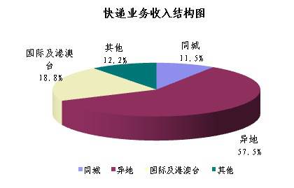 2013年,同城、異地、國際及港澳臺快遞業務收入分別占全部快遞收入的11.5%、57.5%和18.8%;業務量分別占全部快遞業務量的24.9%、72.2%和2.9%。與去年同期相比,同城快遞業務收入的比重上升1.1個百分點,異地快遞業務收入的比重下降2.7個百分點,國際及港澳臺業務收入的比重下降了0.7個百分點。