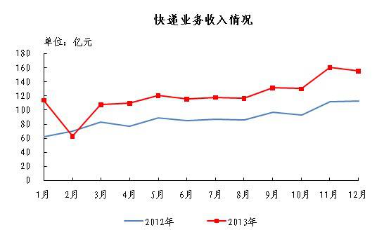 核心提示:2013年郵政及快遞行業業務收入累計完成2547.8億12月份,全行業業務收入完成242.5億元,同比增長31.1%;業務總量完成289.6億元,同比增長39%。