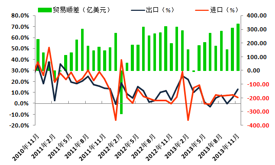 海關數據顯示,2013年11月我國進出口總值同比增長9.3%。其中出口同比增長12.7%,進口同比增長5.3%,這一數據較10月份5.6%和7.6%,一升一降。當月貿易順差為338億美元,較上月增加26.94億美元,創2009年2月以來新高。