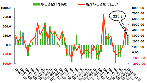 2013年11月外匯占款增加3979億元,較10月4416.02億元有所回落,但仍處相對高位;1-11月該口徑累計新增外匯占款2.5萬億元,已是2012年全年的5倍多。扣除貿易順差與FDI,短期資本已連續3個月凈流入,11月金融項目流入約1400億元。