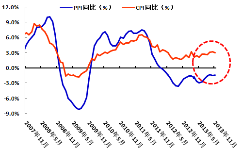 統計局公布2013年11月主要經濟指標,11月CPI同比增長3.0%,PPI同比下降1.4%,工業增加值同比增長10%,1-11月份固定資產投資累計同比增長19.9%。這一系列主要經濟指標顯示,國內經濟增速趨緩。