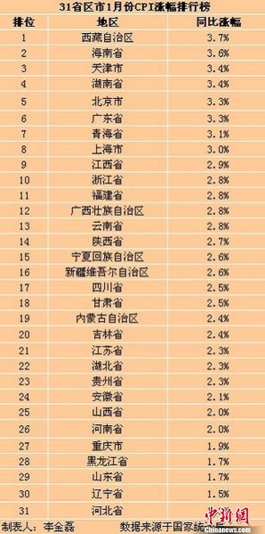 中新網記者梳理發現,與全國2.5%的漲幅相比,西藏、海南、天津、湖南、北京、廣東、青海、上海、江西、浙江、福建、廣西、云南、陜西、寧夏、新疆這16個省區市的1月份CPI漲幅超過了全國水平。