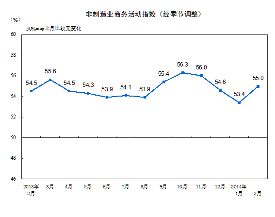 2014年2月中國非制造業商務活動指數為55.0%