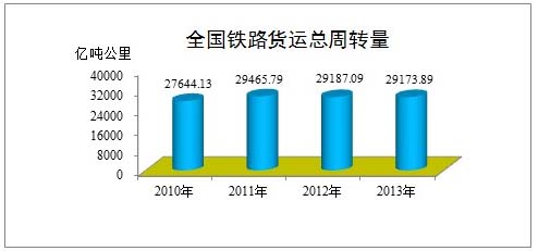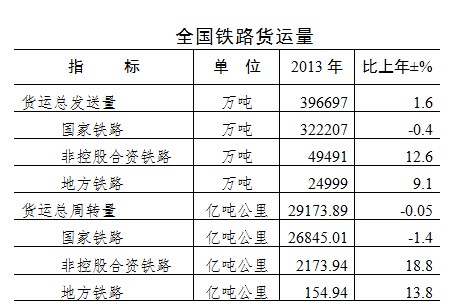 核心提示:2013年全國鐵路貨物發送量完成39.61億噸全國鐵路貨運(含行包)總發送量完成39.67億噸,比上年增加0.63億噸、增長1.6%。其中,國家鐵路32.22億噸,下降0.4%;非控股合資鐵路4.95億噸,增長12.6%;地方鐵路2.50億噸,增長9.1%。全國鐵路貨運(含行包)總周轉量完成29173.89億噸公里,比上年減少13.20億噸公里、下降0.05%。其中,國家鐵路26845.01億噸公里,下降1.4%;非控股合資鐵路2173.94億噸公里,增長18.8%;地方鐵路154.94億噸公里,增長13.8%。