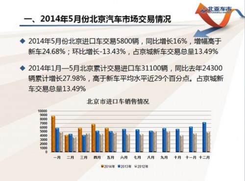 第四、2014年1月—5月北京累計交易進口車31100輛,同比去年24300輛累計增長27.98%,高于新車平均水平近29個百分點。占京城新車交易總量13.49%