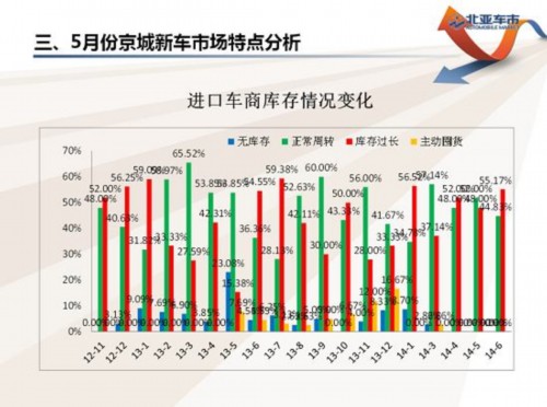 第三、2014年5月份北京進口車交易5800輛,同比增長16%,增幅高于新車24.68%;環比增長-13.43%,占京城新車交易總量13.49%