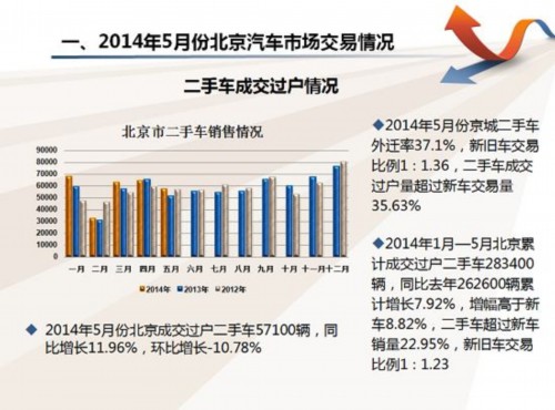 第五、2014年5月份北京成交過戶二手車57100輛,同比增長11.96%,環比增長-10.78%