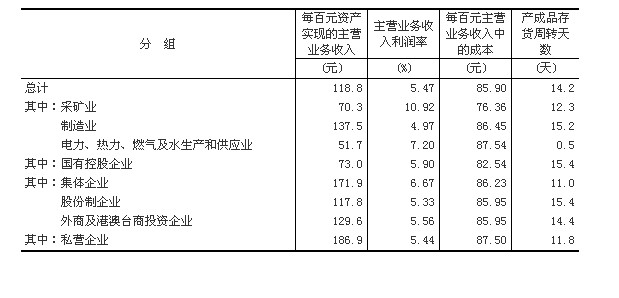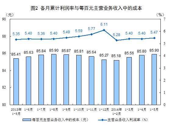 1-5月份,規模以上工業企業主營業務收入利潤率為5.47%,每百元主營業務收入中的成本為85.9元,每百元資產實現的主營業務收入為118.8元,產成品存貨周轉天數為14.2天。