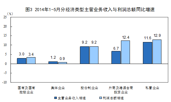 1-5月份,在規模以上工業企業中,國有及國有控股企業實現利潤總額6012.8億元,同比增長3.4%;集體企業實現利潤總額282.5億元,增長0.9%;股份制企業實現利潤總額13380.6億元,增長9.2%;外商及港澳臺商投資企業實現利潤總額5529.7億元,增長12.4%;私營企業實現利潤總額7335.1億元,增長12.9%。
