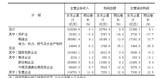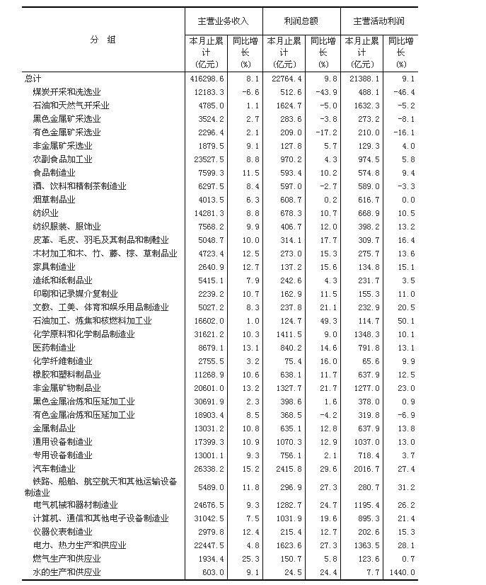 1-5月份,在41個工業大類行業中,32個行業利潤總額同比增長,1個行業持平,8個行業下降。主要行業利潤增長情況:農副食品加工業利潤總額同比增長4.3%,紡織業增長10.7%,石油加工、煉焦和核燃料加工業增長49.3%,化學原料和化學制品制造業增長9%,非金屬礦物制品業增長21.7%,黑色金屬冶煉和壓延加工業增長1.6%,通用設備制造業增長12.9%,專用設備制造業增長2.1%,汽車制造業增長29.6%,電氣機械和器材制造業增長24.7%,計算機、通信和其他電子設備制造業增長19.6%,電力、熱力生產和供應業增長27.3%,煤炭開采和洗選業下降43.9%,石油和天然氣開采業下降5%,有色金屬冶煉和壓延加工業下降4.2%。