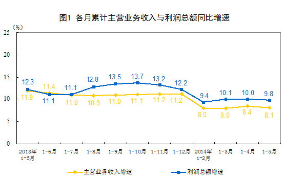核心提示:統計局:前5月規模以上工業企業利潤同比增長9.8%據國家統計局網站發布數據顯示,今年1-5月份,全國規模以上工業企業實現利潤總額22764.4億元,同比增長9.8%,增速比1-4月份回落0.2個百分點;實現主營活動利潤21388.1億元,同比增長9.1%,增速與1-4月份持平。
