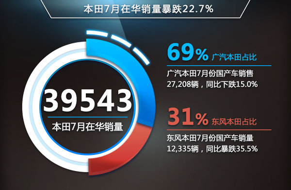 本田在華兩家合資公司廣汽本田和東風(fēng)本田7月銷量皆出現(xiàn)下滑,其中廣汽本田7月份國產(chǎn)車為27,208輛,同比下跌15.0%,東風(fēng)本田7月份國產(chǎn)車銷量12,335輛,同比暴跌35.5%。前7個(gè)月的累計(jì)銷量,廣汽本田即便依靠新車凌派依然略低于去年同期,東風(fēng)本田則憑借CR-V和新車杰德增長16%,從而使得本田在華累計(jì)總銷量依然實(shí)現(xiàn)同比增長。